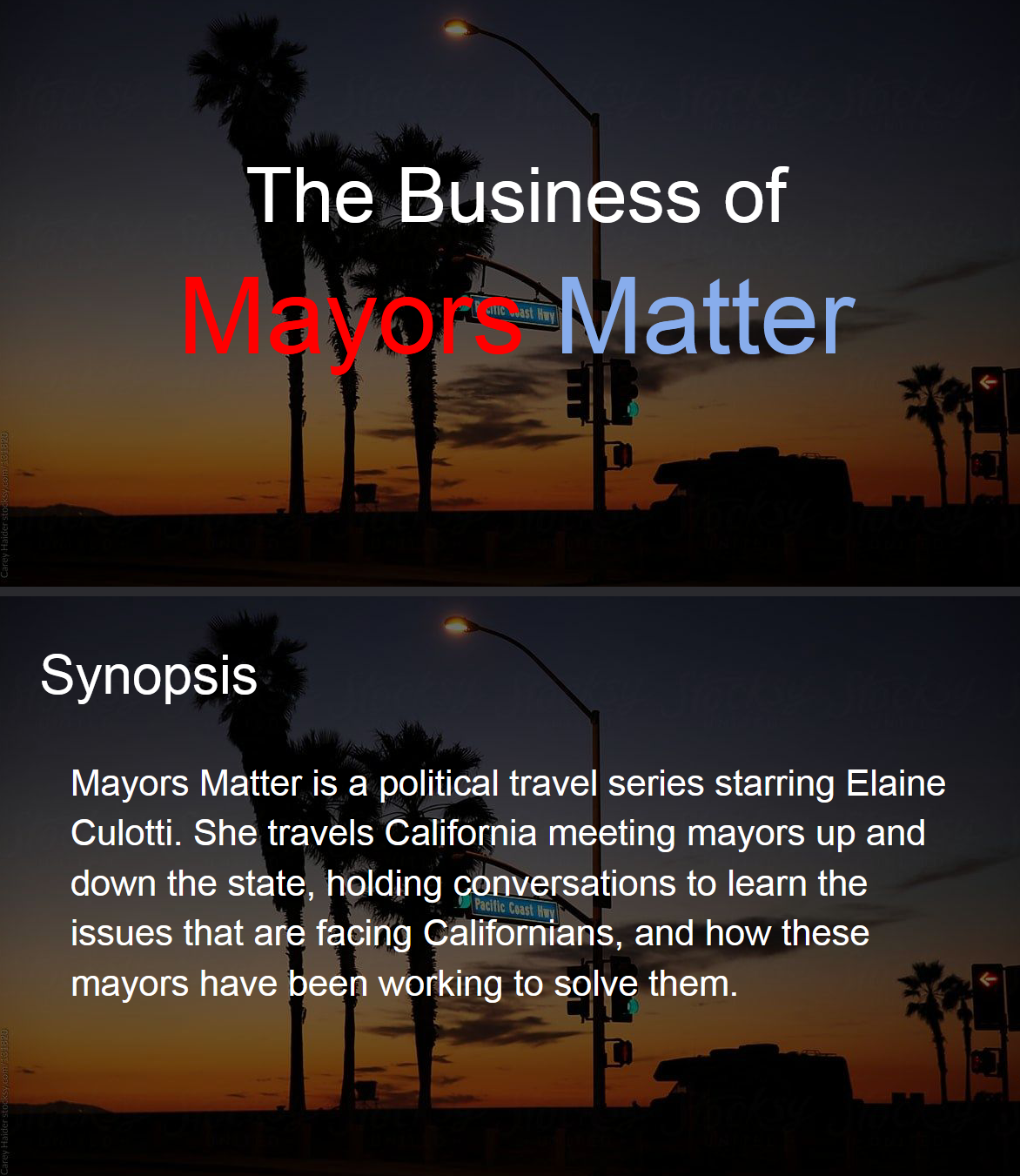 Mayors Matter is a political travel series starring Elaine Culotti. She travels California meeting mayors up and down the state, holding conversations to learn the issues that are facing Californians, and how these mayors have been working to solve them.