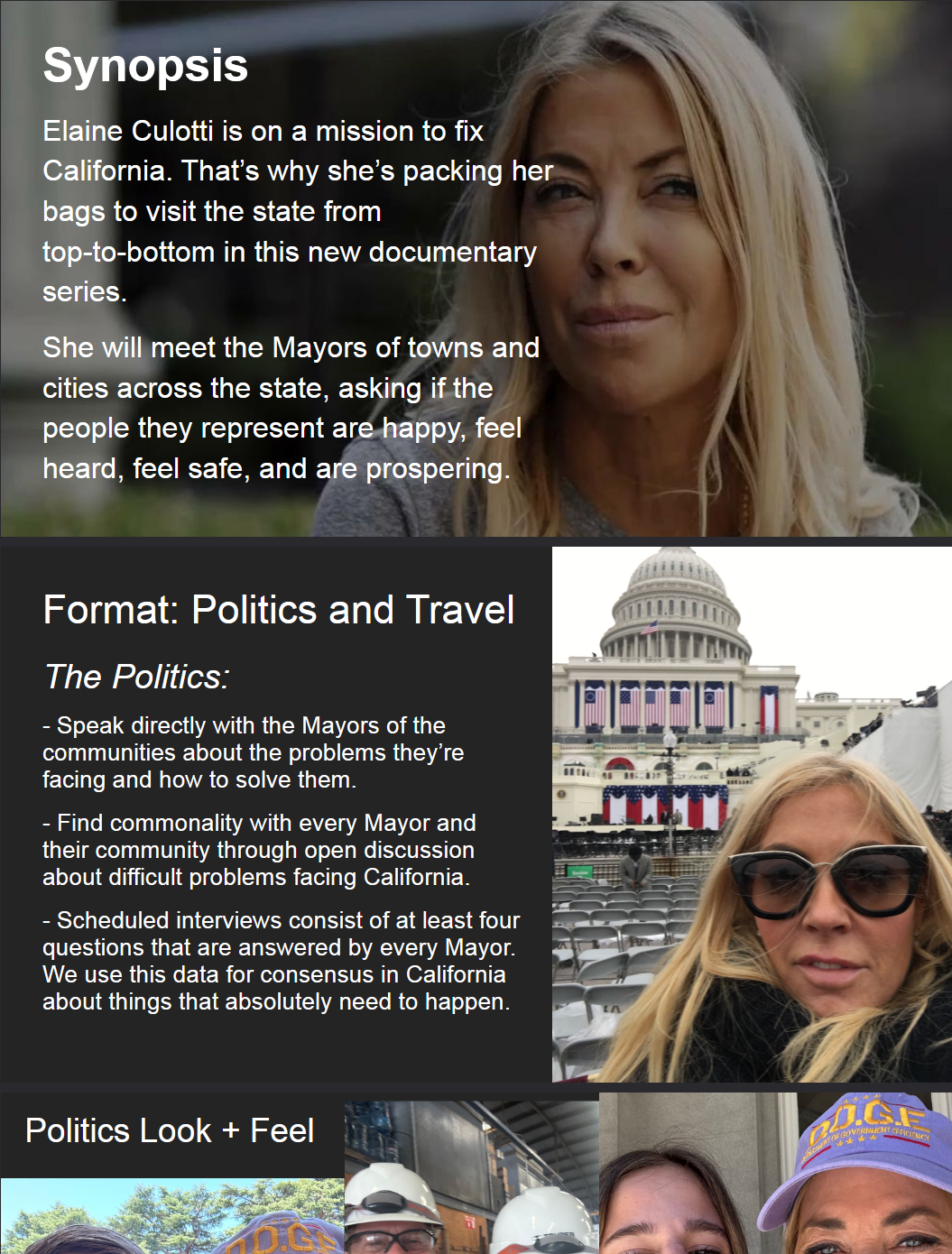 Elaine Culotti is on a mission to fix California. That’s why she’s packing her bags to visit the state from top-to-bottom in this new documentary series. She will meet the Mayors of towns and cities across the state, asking if the people they represent are happy, feel heard, feel safe, and are prospering.
